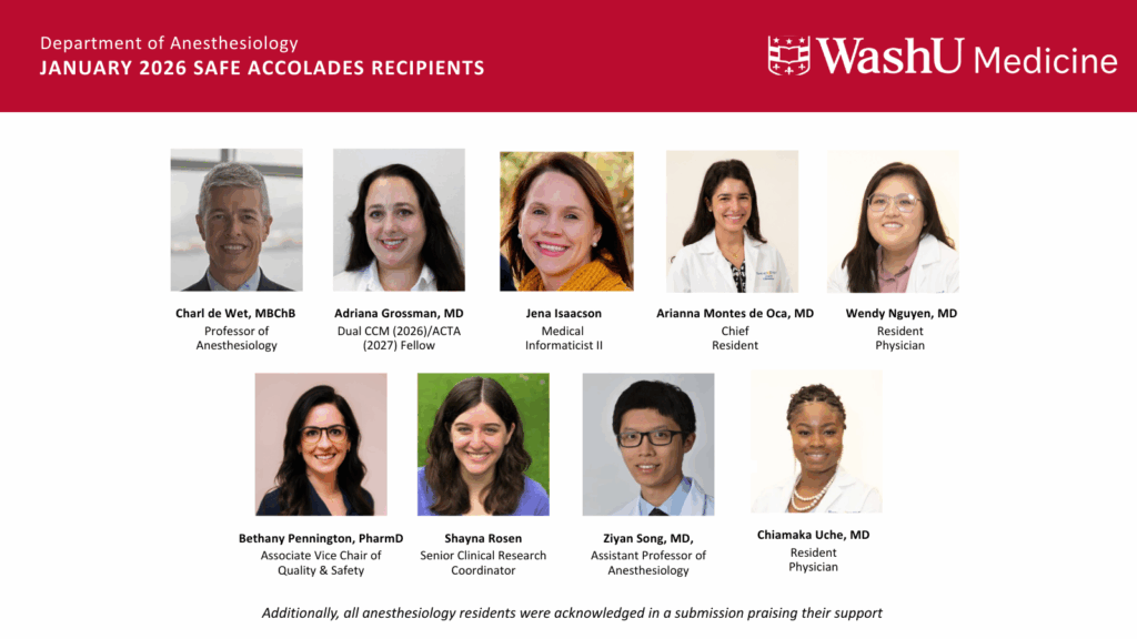 “Congratulations to our recent SAFE accolade recipients,” said Michael S. Avidan, MBBCh, FCA SA, Dr. Seymour and Rose T. Brown Professor and head of the Department of Anesthesiology. “Each of these individuals has gone above and beyond in their roles, exemplifying the core values of professionalism, empathy, and integrity. Their actions not only contribute to the well-being of our patients but also foster a culture of respect and collaboration within our department.”